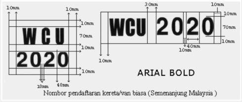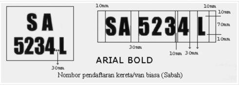- Menggunakan font jenis Arial Bold. Ukuran ketinggian huruf dan angka hendaklah 40 milimeter. Setiap Bahagian bagi setiap huruf atau angka hendaklah 7 milimeter lebar dan lebar keseluruhan jarak yang diambil bagi setiap angka, kecuali angka 1, hendaklah 30 milimeter.